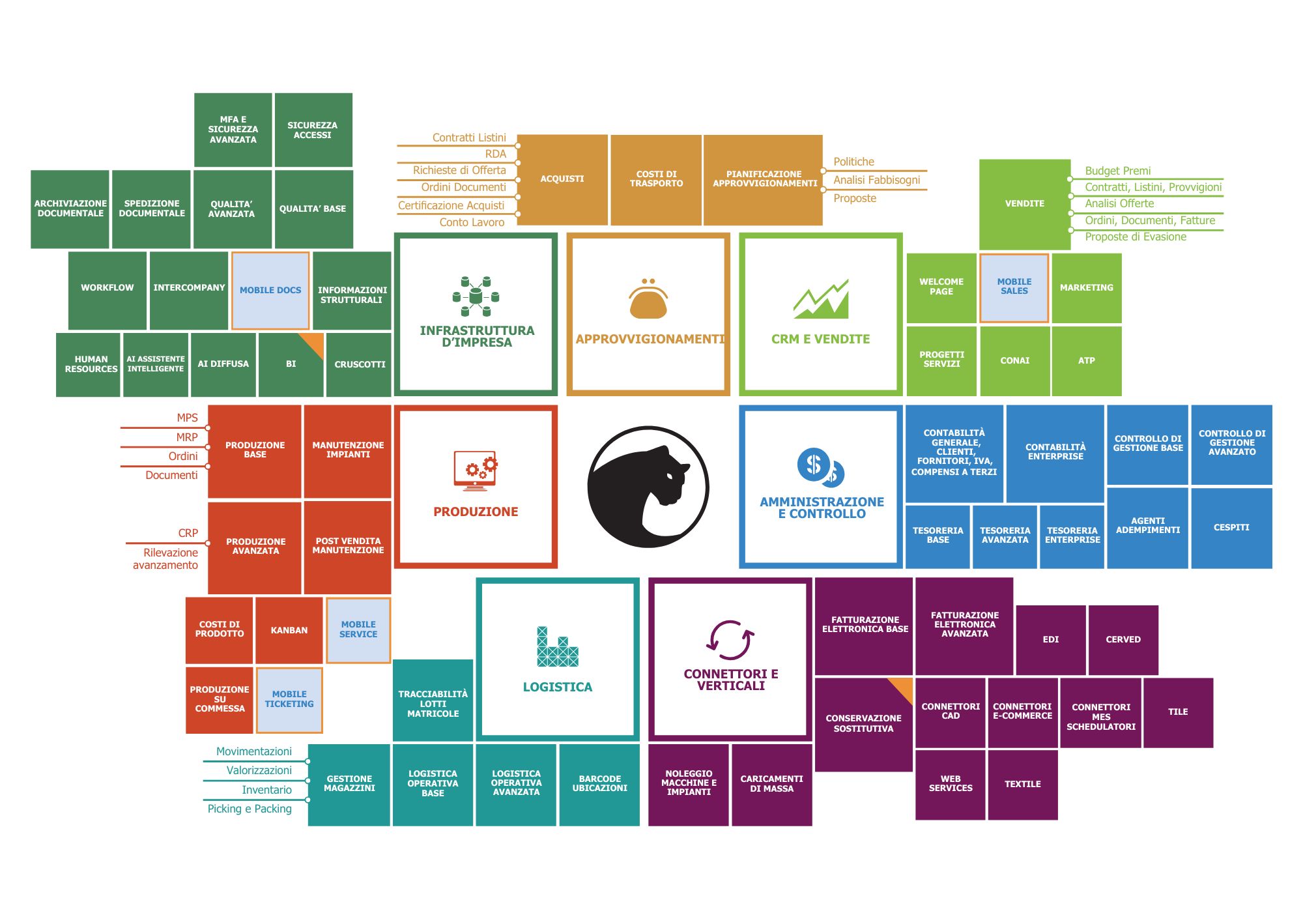 Soluzione completa e modulabile in base alle esigenze: Panthera rappresenta una soluzione unica per governare tutta l’impresa. Ma offre anche la possibilità di acquistare esclusivamente specifiche funzionalità, per ottimizzare in modo mirato aree nevralgiche della tua impresa, senza investimenti ingenti.